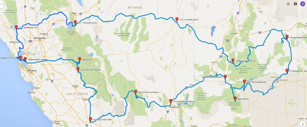 With our appetite unsatiated exploring the Western USA on out Route 66 tour, we undertook another 5000km tour of the US covering as many National Parks as possible while taking in the ever changing desert riding conditions, culture and colours of California, Nevada, Arizona and Utah. As they say it just kept giving. The Scenery combined with camaraderie and overpowered Harleys was a recipe for an outstanding time. Hydro took it on himself to load up all our routes as well as the special side trips (which are only disclosed on a needs to know basis) and navigated us through the two weeks. We picked up the Bikes in San Francisco while we were acclimating by running the Bay to Breakers, hitting up the Piano Bars and generally doing a reccy on the town. Other riders where Singo, Boxy, Russ, Richo and Mike.