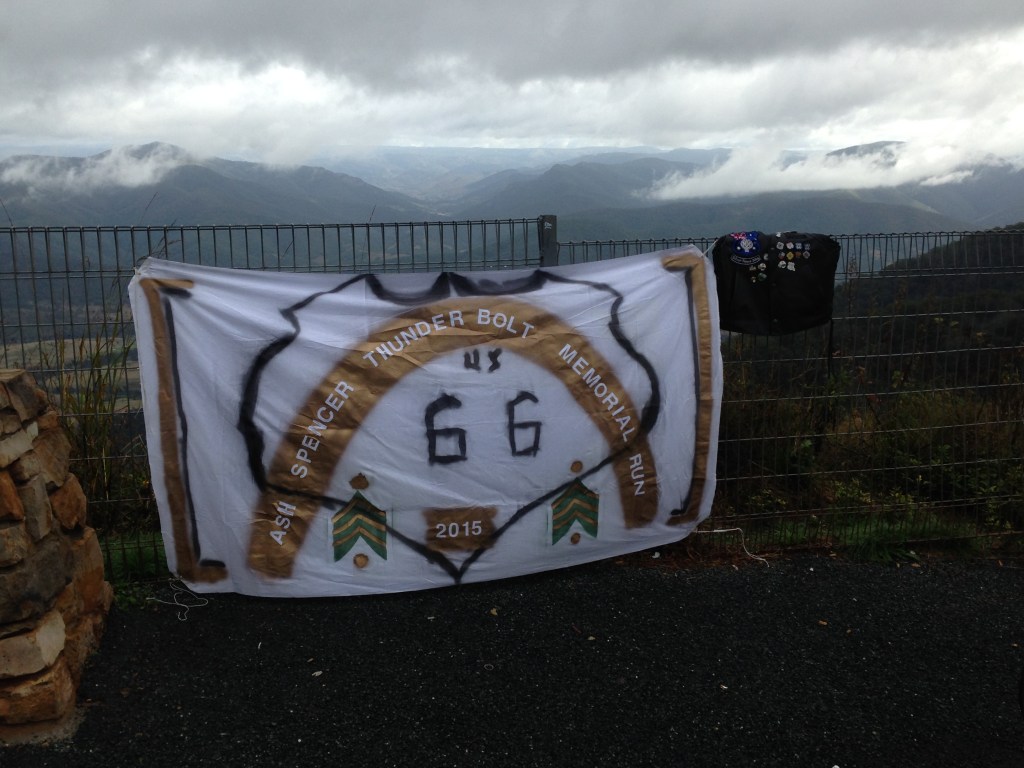 The weather conditions were rugged and overcast but the road conditions were excellent for this highly tuned group of riders. We arrived at the lookout and Gibbo rolled out his memorial flag and we set it up and had a toast to our great mate.