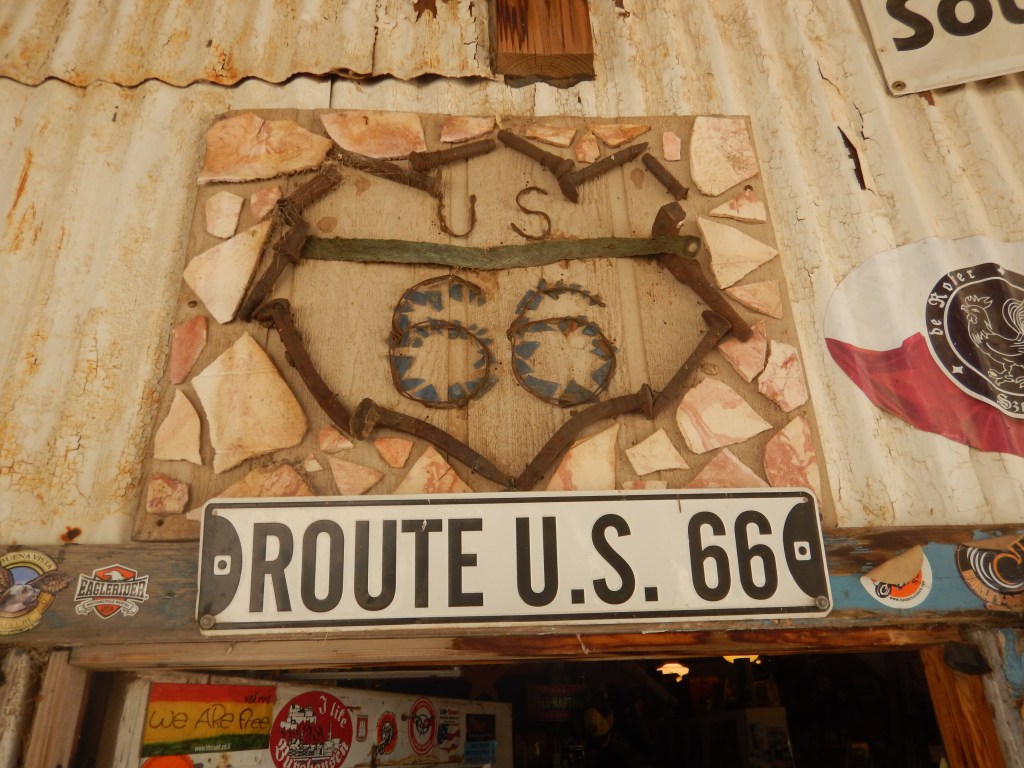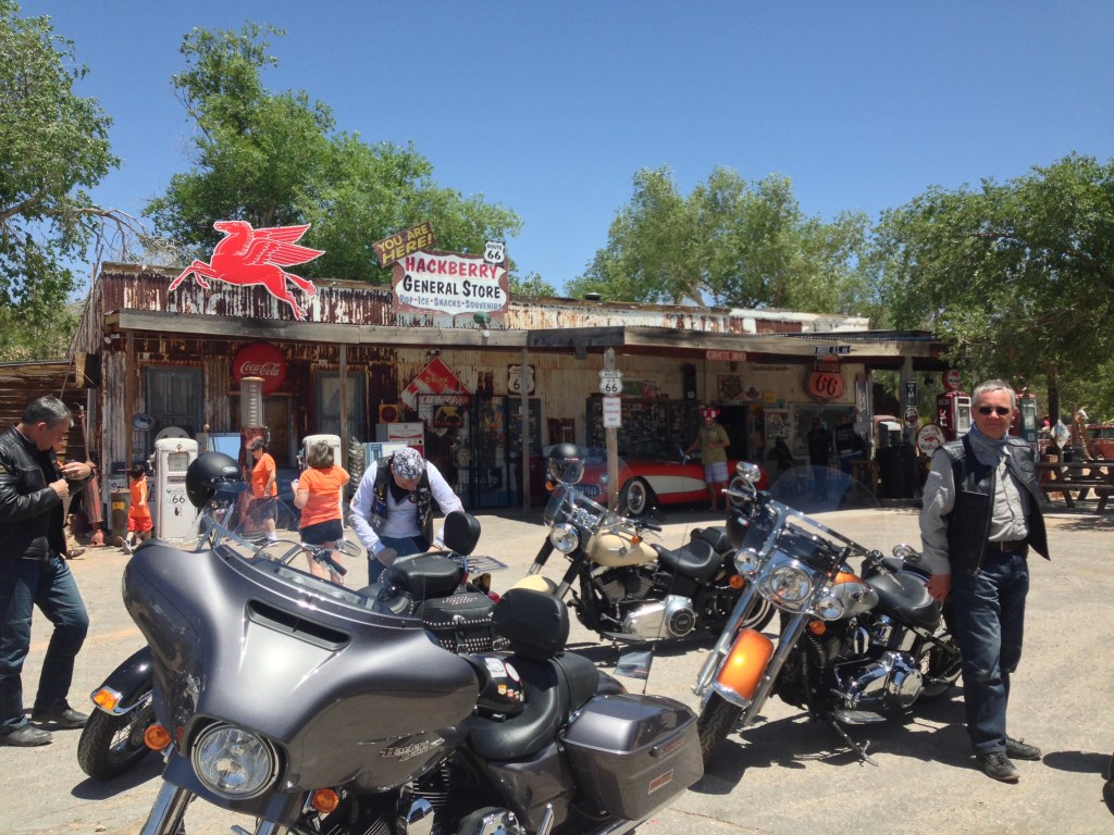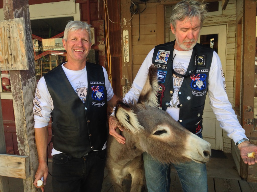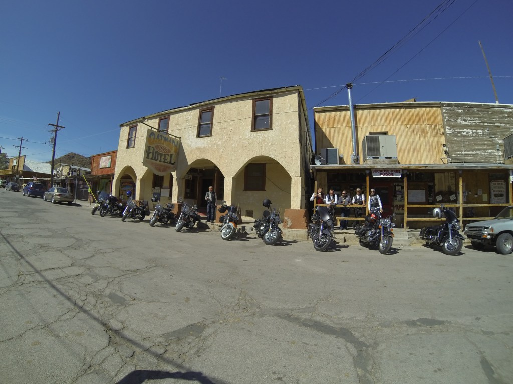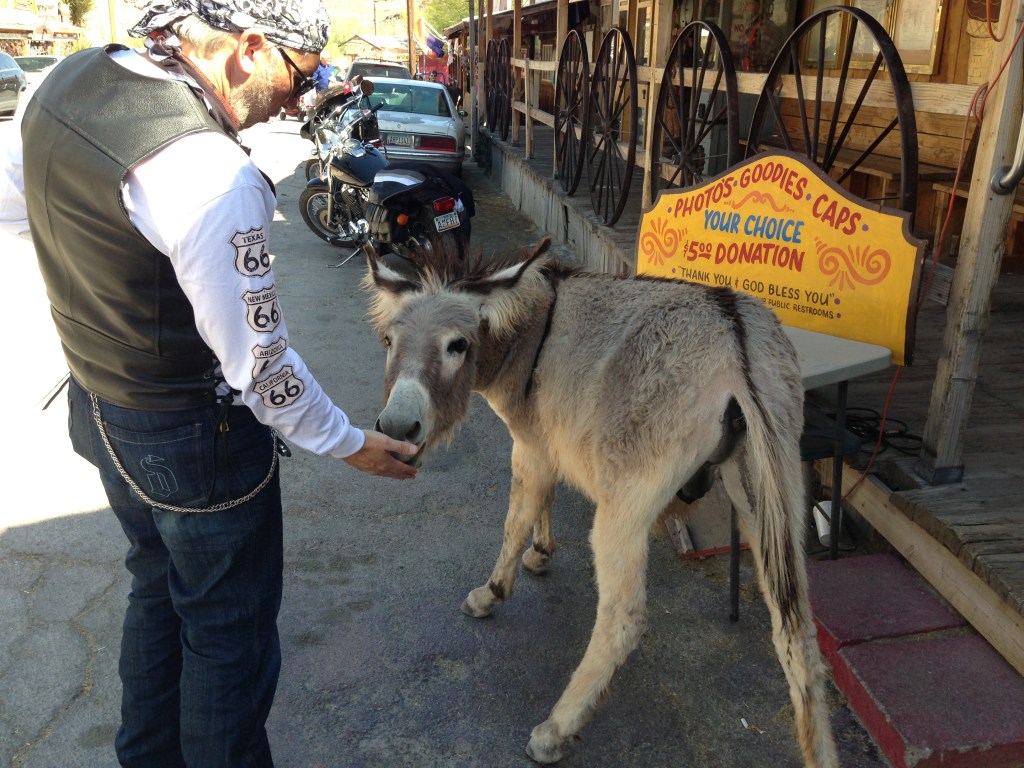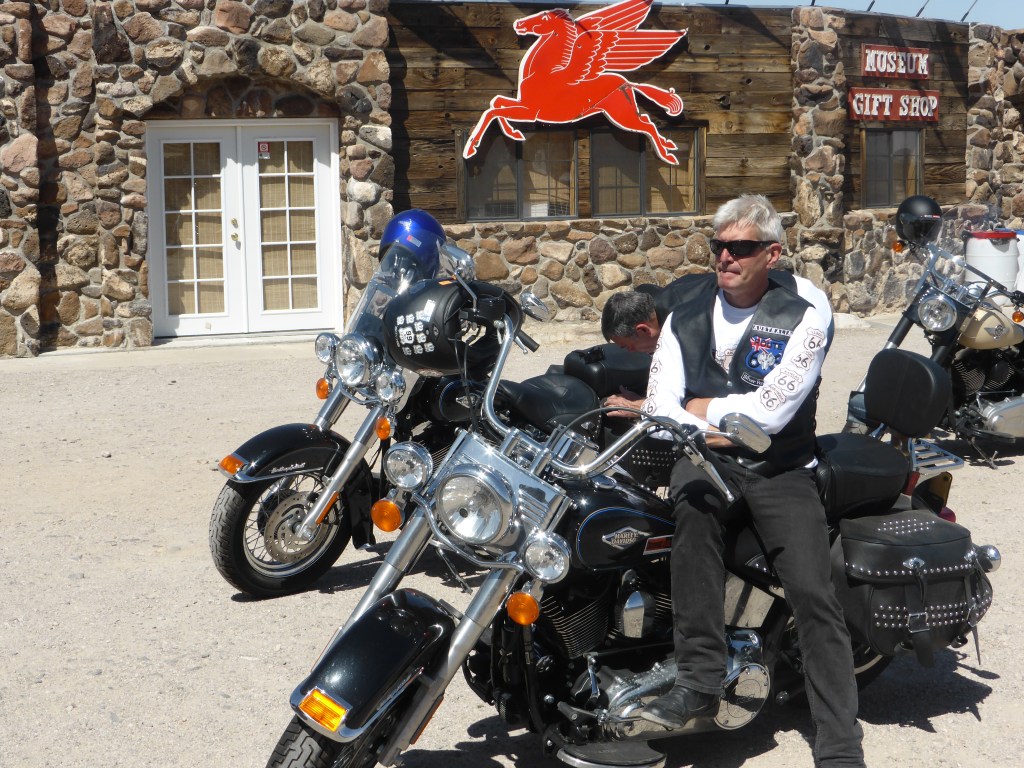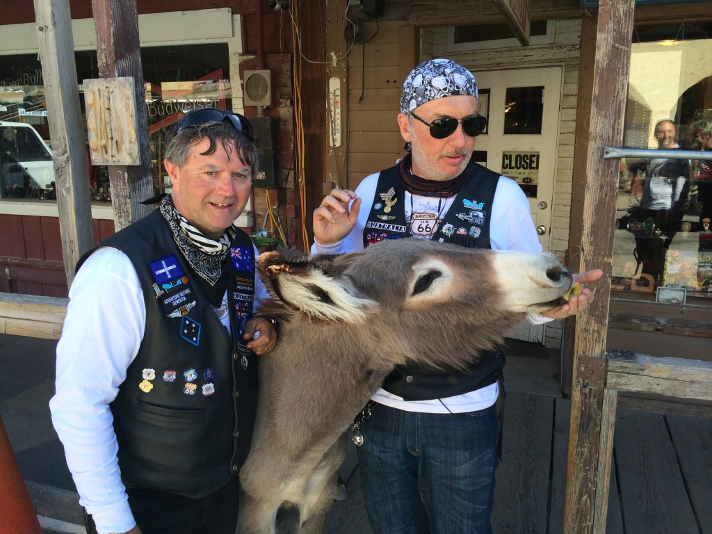 Our first stop is Seligman, a town which exists only for Route 66 memorabilia. We have breakfast at Lilo’s and then a wander around this odd little town. Elvis is there! It is dry and hot and we are back to white t-shirts for riding. On we go through the desert stopping at a couple of spots, Hackberry (nudey pictures from 1972 magazines in the bathroom) & Cool Springs (which it is not) to take photos of the surrounds and check out the souvenirs! The Landscape now changes and we are into the barren hills. We stop at the Harley dealer in Kingman and then, crossing the border over the Colorado River into California, onto Needles. This is the best riding yet. We wind through the hills leaning through the sharp corners, stopping at Dead Man’s curve (where many cars came off this road when it was dirt and rock) and Oatman. You’re kidding, donkeys roaming all over the main street of this tiny western town. Stop for an hour.