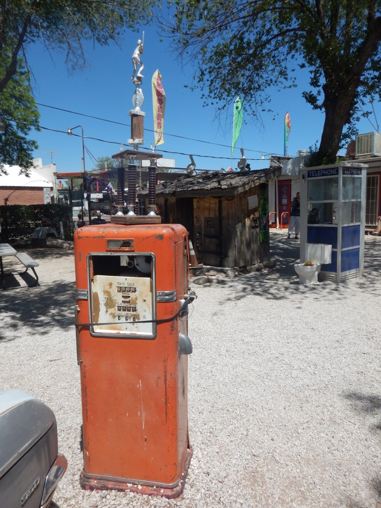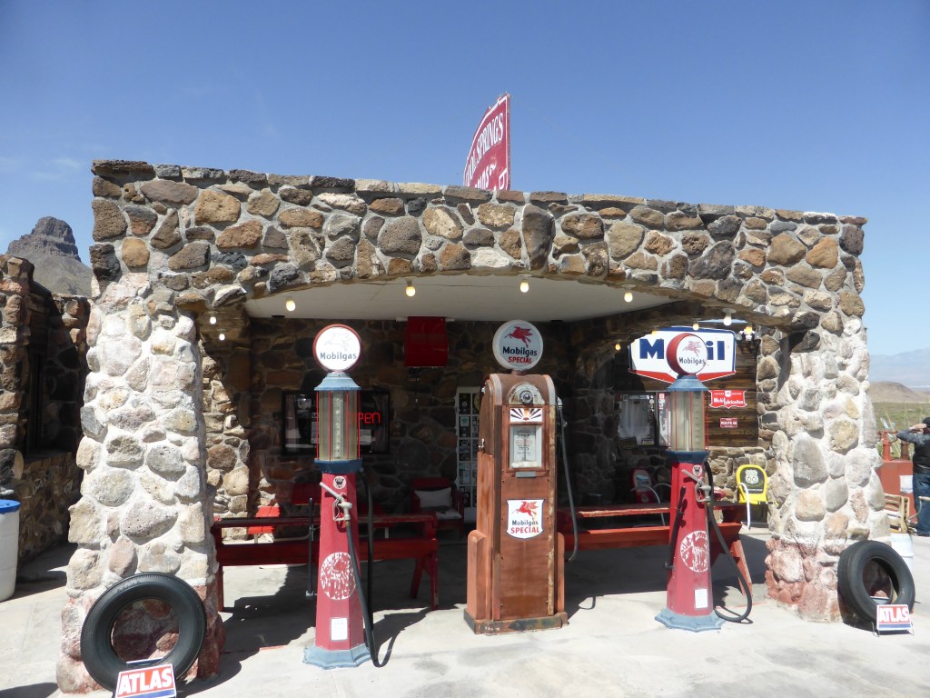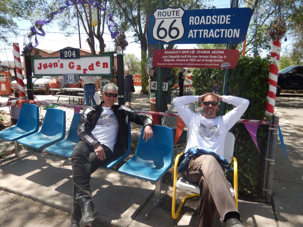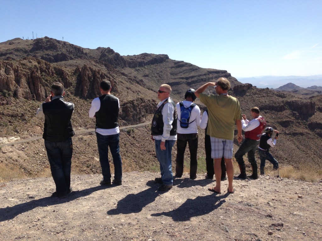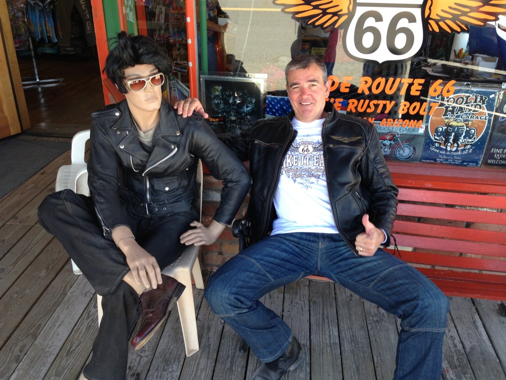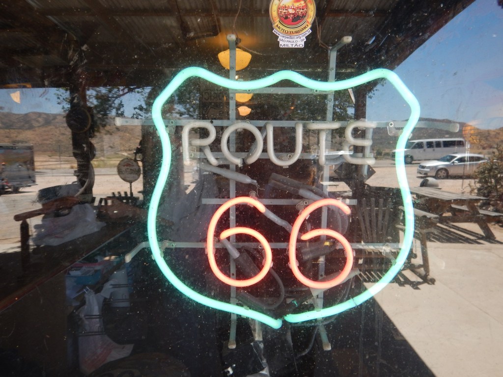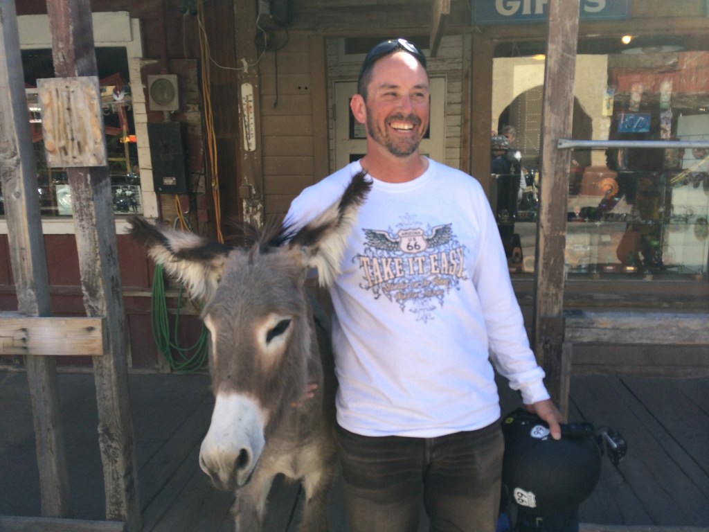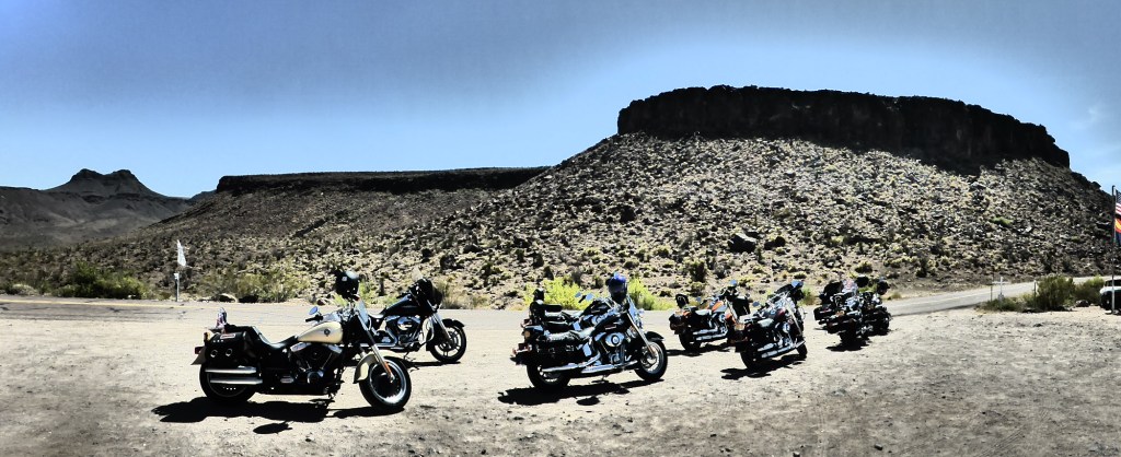 Our first stop is Seligman, a town which exists only for Route 66 memorabilia. We have breakfast at Lilo’s and then a wander around this odd little town. Elvis is there! It is dry and hot and we are back to white t-shirts for riding. On we go through the desert stopping at a couple of spots, Hackberry (nudey pictures from 1972 magazines in the bathroom) & Cool Springs (which it is not) to take photos of the surrounds and check out the souvenirs! The Landscape now changes and we are into the barren hills. We stop at the Harley dealer in Kingman and then, crossing the border over the Colorado River into California, onto Needles. This is the best riding yet. We wind through the hills leaning through the sharp corners, stopping at Dead Man’s curve (where many cars came off this road when it was dirt and rock) and Oatman. You’re kidding, donkeys roaming all over the main street of this tiny western town. Stop for an hour.